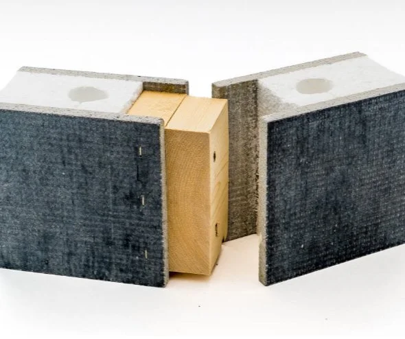 The TechPanel is a combination of insulation, cement, sheathing, and lumber framing. This product has good insulation value and fire resistance. The panels are prefabricated to improve the speed of a projects timeline.